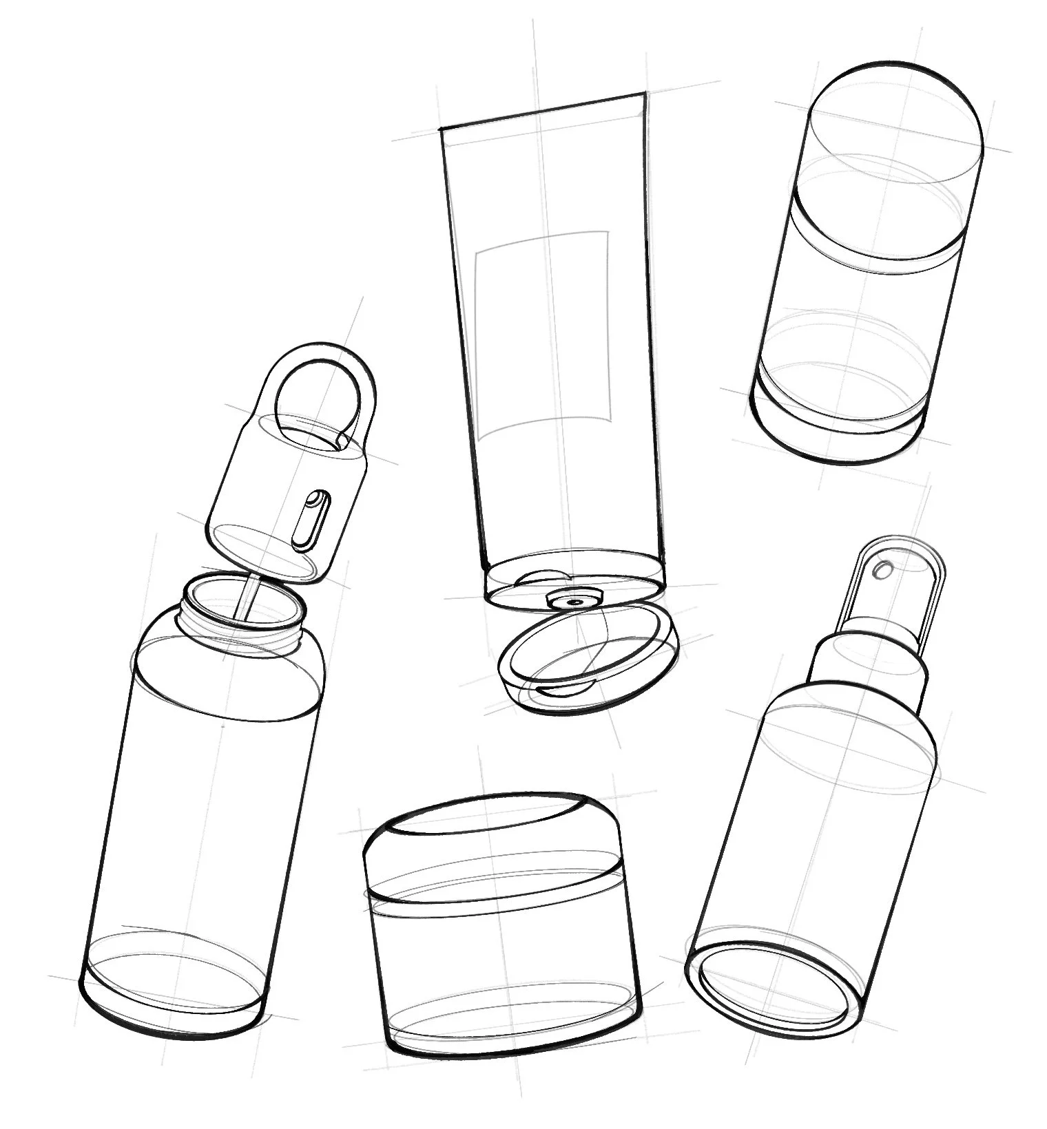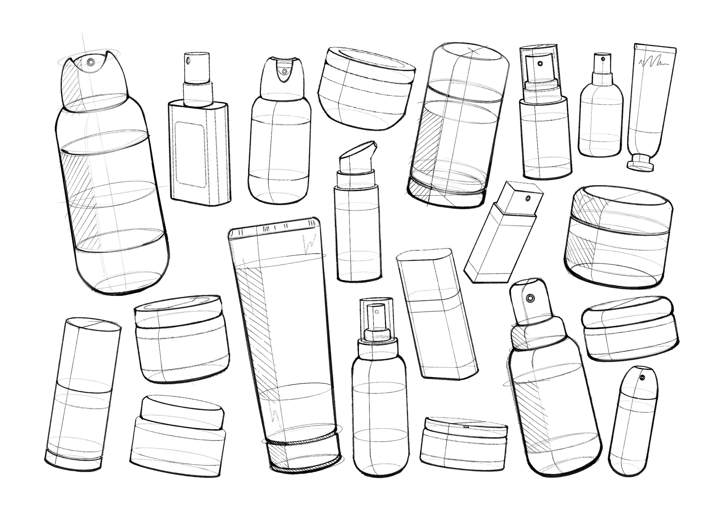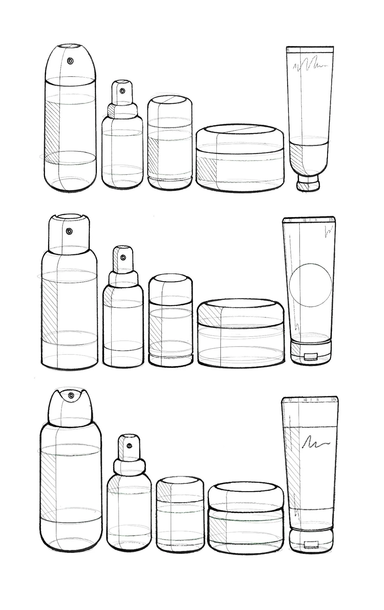 multiple bottle concepts with a variety of application methods, having a minimalistic impression and subtle stylish elements