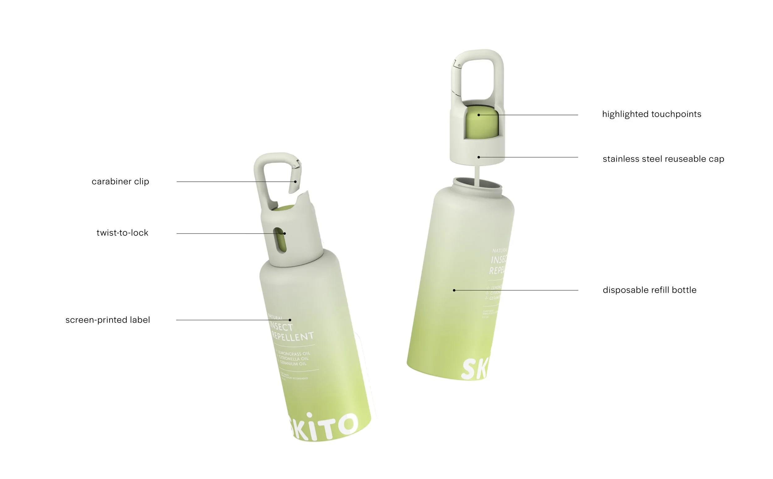 The packaging design for SKITO is heavily inspired by cosmetic products to give the brand a high-end appeal. Sustainability is incorporated into the brand’s image through its refillable packaging.